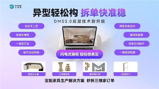 冯欢泉特别提到,DMS3.0的建模技术是聚集成自研的建模核心技术,能够支持二维三维建模设计,实现CAD图纸和设计场景一体化。设计师可在柜体上做多种布尔运算,轮廓提取,造型拉伸,轻松构建复杂造型,例如洞洞板、蜂窝柜、立体圆弧柜、C型槽柜门等复杂工艺,满足个性业务需求。与DMS 2.0相比,DMS 3.0在效率上提升了90%以上,能够快速制造出原本无法实现的复杂造型。