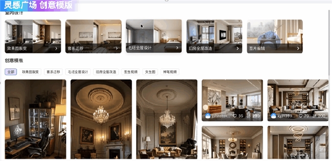 在灵感创意阶段:创意生图多场景应用,上传一张图片,AIGC即可一键生成多套全屋的装修设计。创新灵感广场支持"同款创作"功能,一键创作相似但不相同的多张效果图,实现灵感获取到方案落地的无缝衔接。