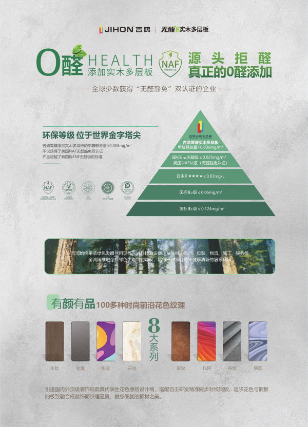在胶水使用方面,吉鸿采用无醛生态胶作为板材的胶粘剂,从源头杜绝甲醛的产生,实现了真正意义上的0醛添加。